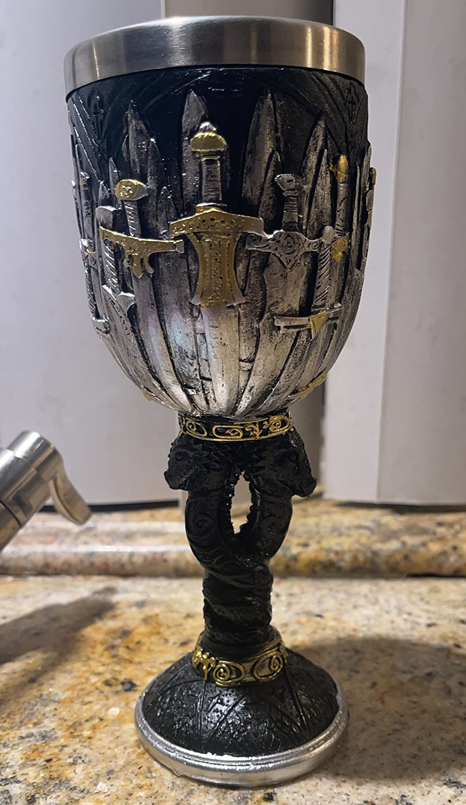 Cada copa está elaborada con resina de alta calidad y un revestimiento interior de acero inoxidable, lo que garantiza durabilidad, peso y un acabado realista tipo medieval.